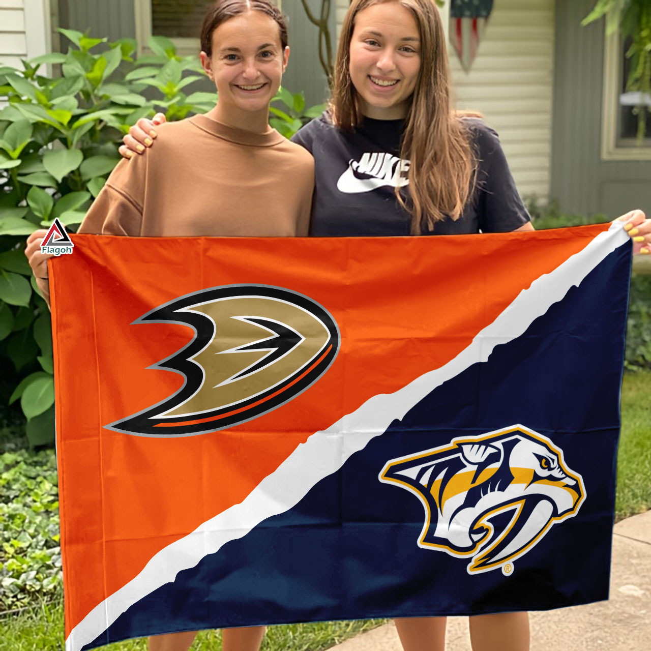 Embrace the battle for orange supremacy with this Ducks vs. Predators House Divided Flag! This vibrant flag features the Anaheim Ducks logo on one side and the Nashville Predators logo on the other, a perfect display for any fan with a divided heart. Made from durable, weather-resistant material, this flag is built to endure the elements and fly proudly through every game day and beyond. With vivid team colors and logos taking center stage, this flag ensures your divided loyalties are on full display. Let the games begin! Show your love for both teams and playfully acknowledge the competition with this unique House Divided Flag.