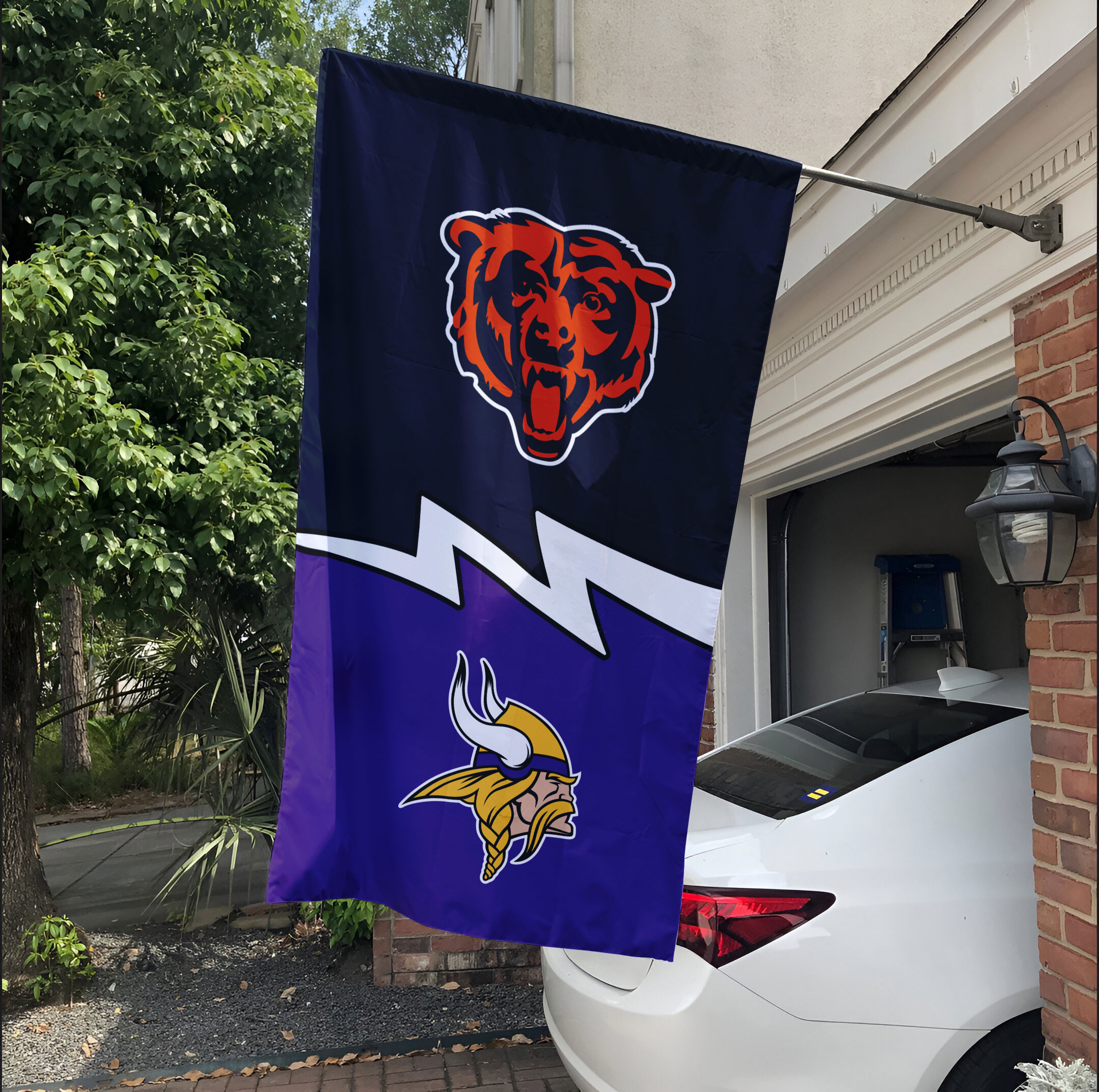 Hang it in your house or at your next tailgate to playfully stir the pot on game day. The Chicago Bears and Minnesota Vikings logos are prominently featured, leaving no doubt which side you cheer for. Available in multiple sizes, you’re sure to find the perfect fit to represent your divided house with pride. Don’t miss out on this fun way to celebrate your NFC North fandom – get your Bears vs Vikings House Divided Flag today!