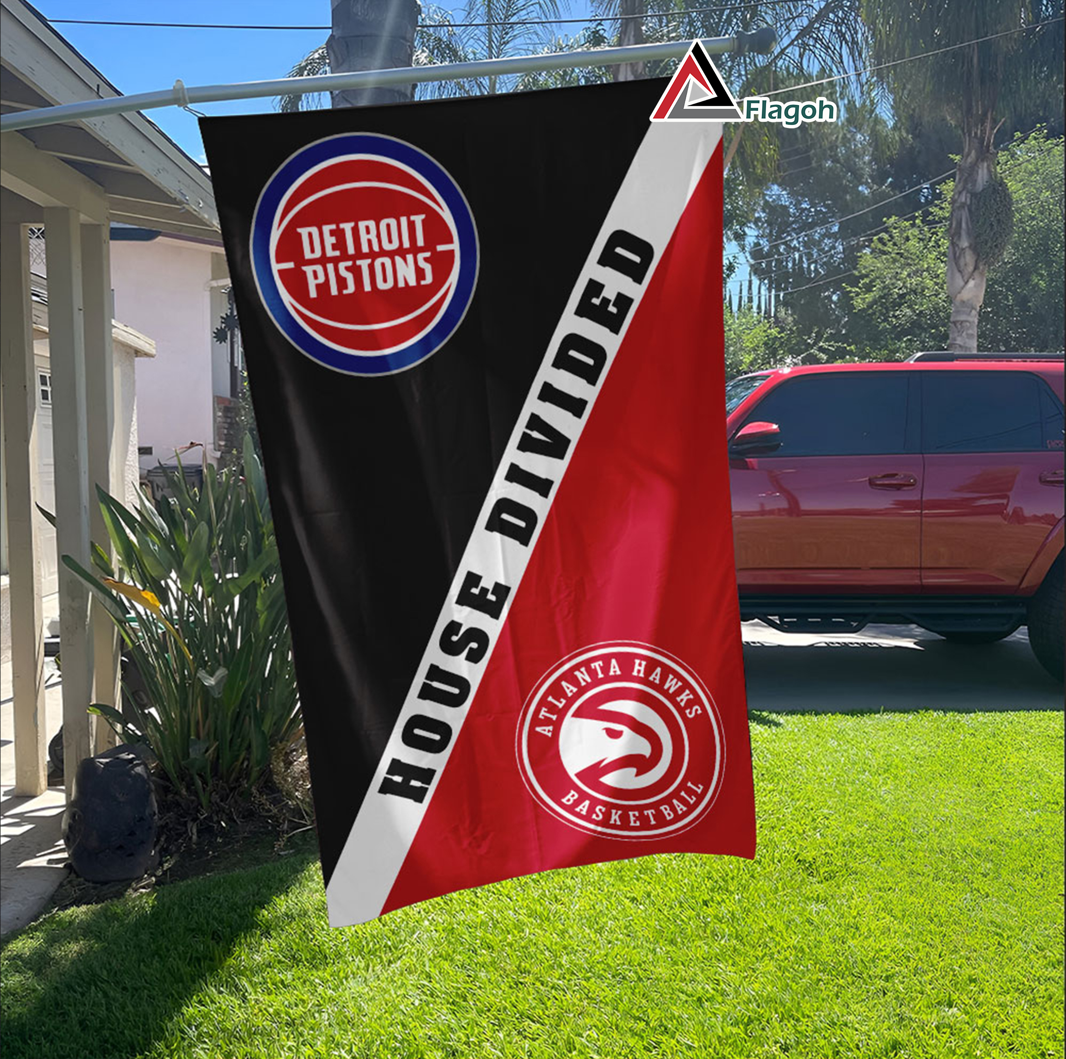 Pistons vs Hawks House Divided Flag meaning: This diagonally split flag proudly displays the iconic logos of the Pistons and Hawks. Representing fans passionate for Eastern contenders old and new.