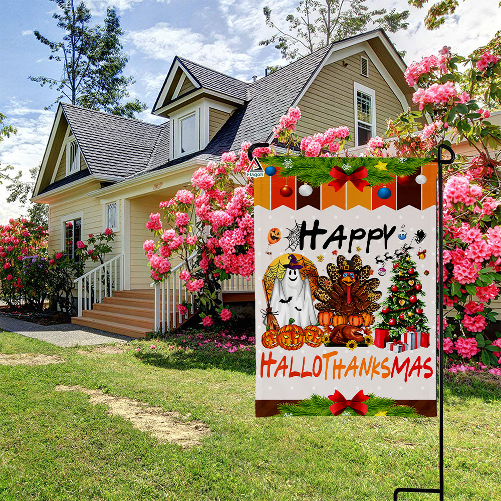 Happy HalloThanksMas Garden Flag, Seasonal October Flag for Yard Outside Decorations