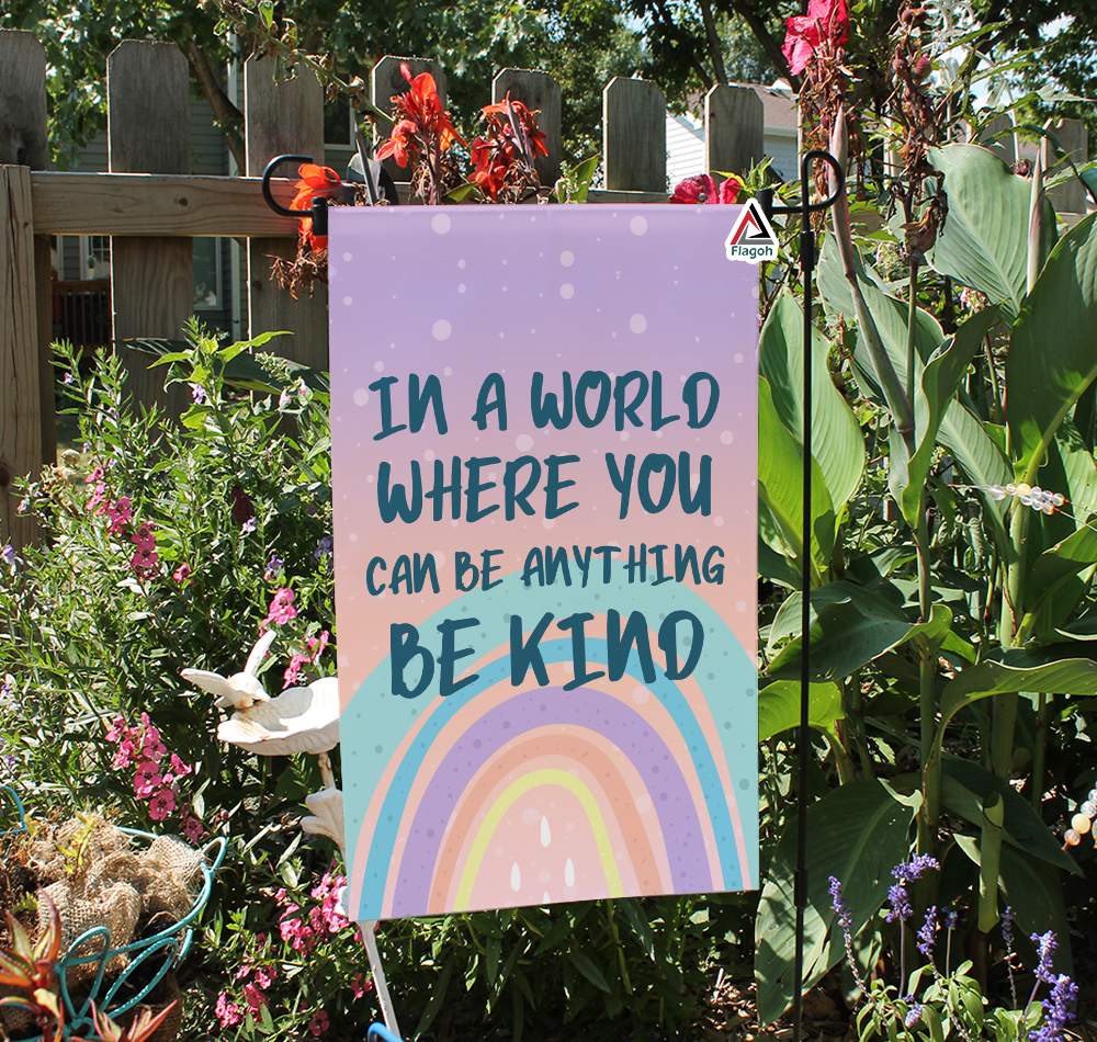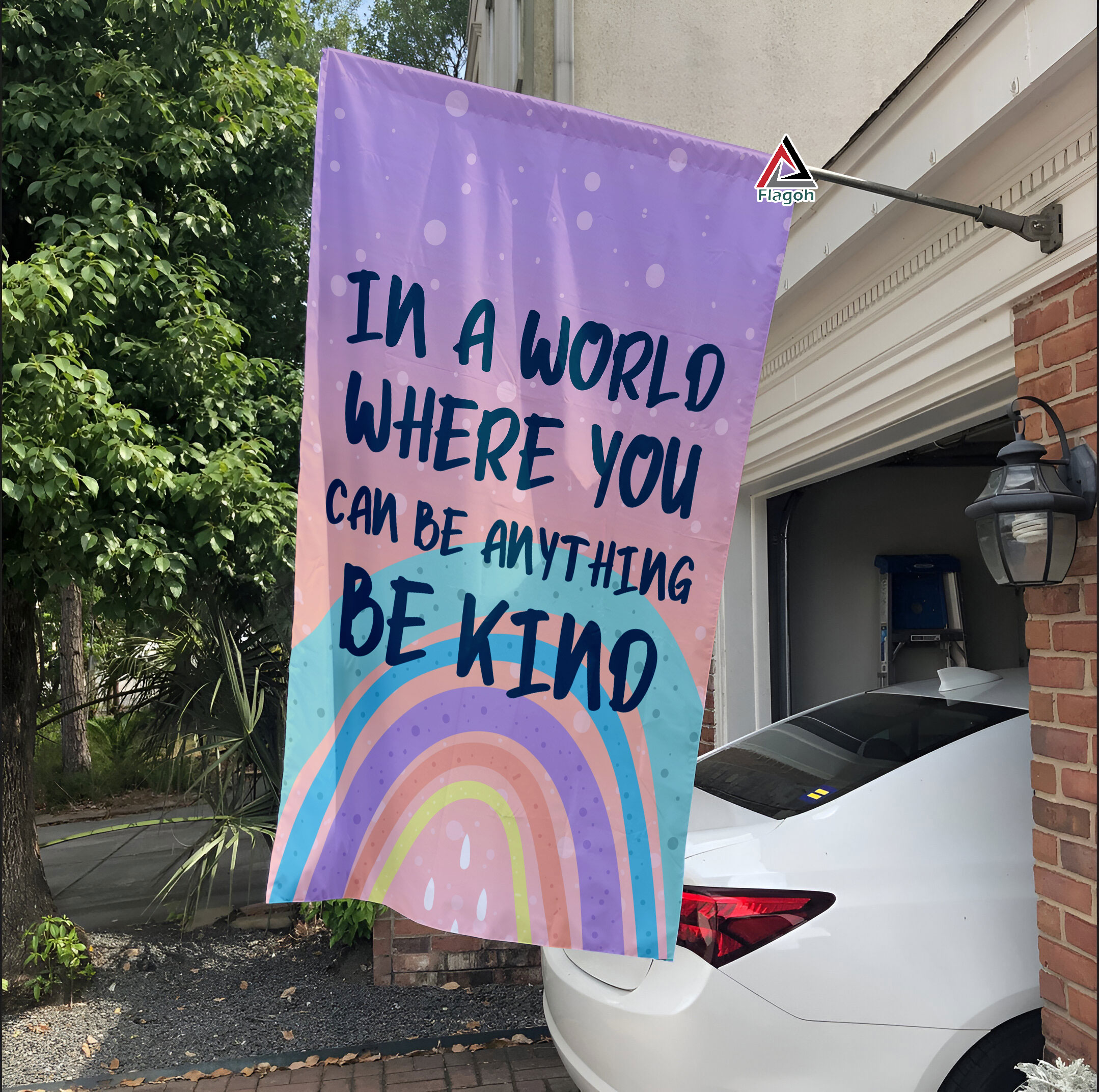 Remind the world to choose kindness with the powerful “In a World Where You Can Be Anything Be Kind” Flag! This inspirational flag features a thought-provoking message that resonates with everyone, making it a perfect addition to your home decor.
