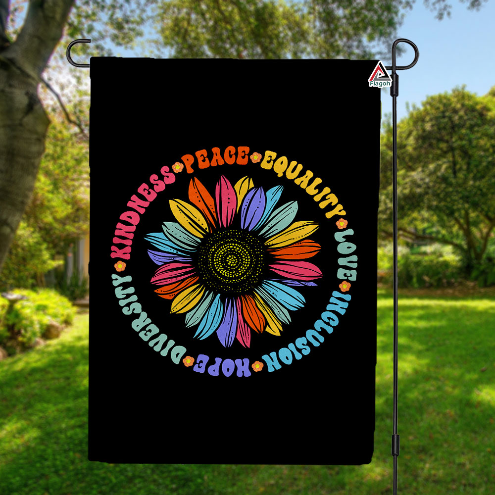 Kindness Peace Equality Love Inclusion Hope Diversity House Flag, Sunflower Ally Pride Garden Flag