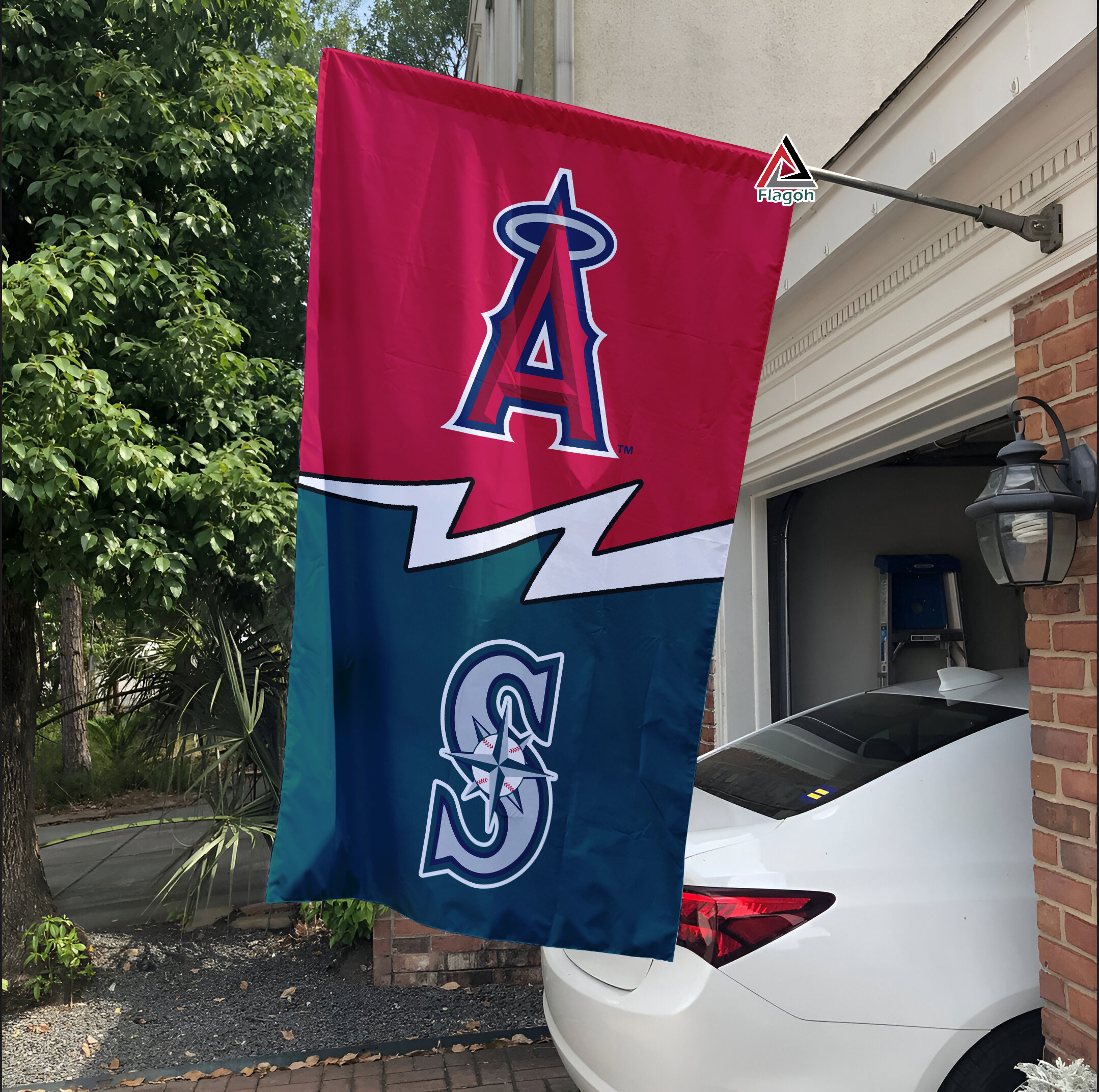 The split design of the flag showcases the logos and colors of both teams, with the Angels’ red and white on one side and the Mariners’ navy blue and teal on the other. This flag is a perfect way to display your loyalty to your team while also acknowledging the rivalry with the other.