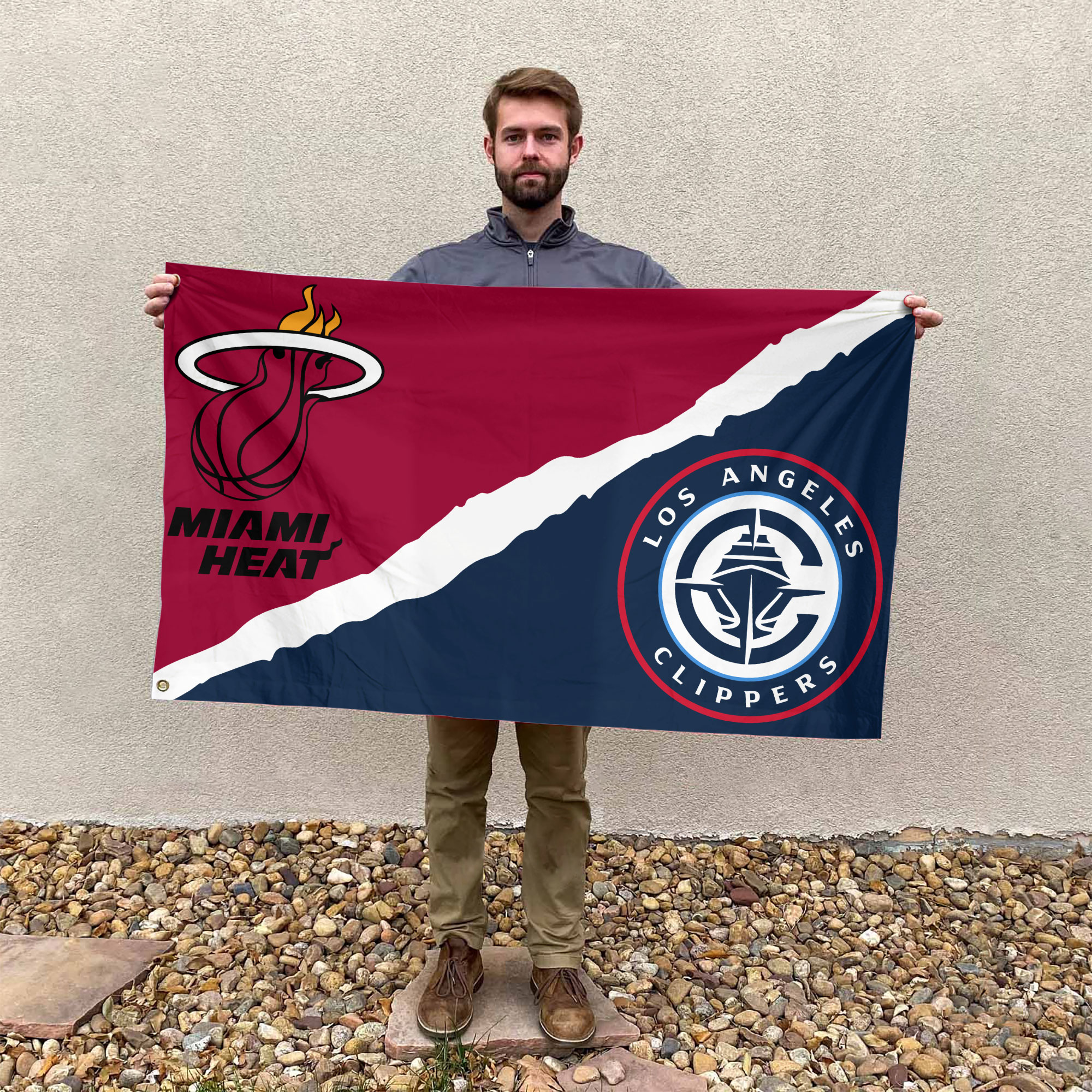 - Vibrant Dual-Team Design: Features the iconic logos and colors of Miami and LA basketball teams, creating a visually dynamic flag that stands out.