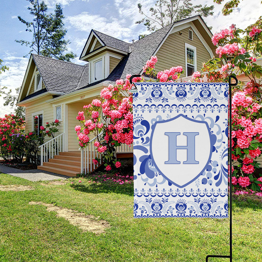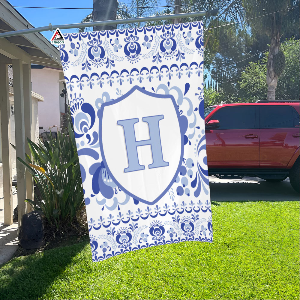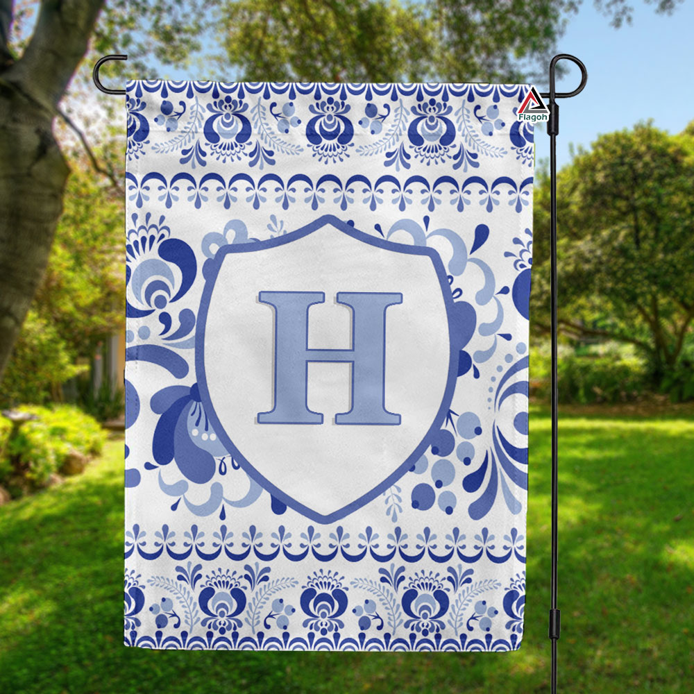 Monogrammed Welcome Garden & House Flag, Custom Blue Floral Chinoiserie Spring & Summer Garden Flag