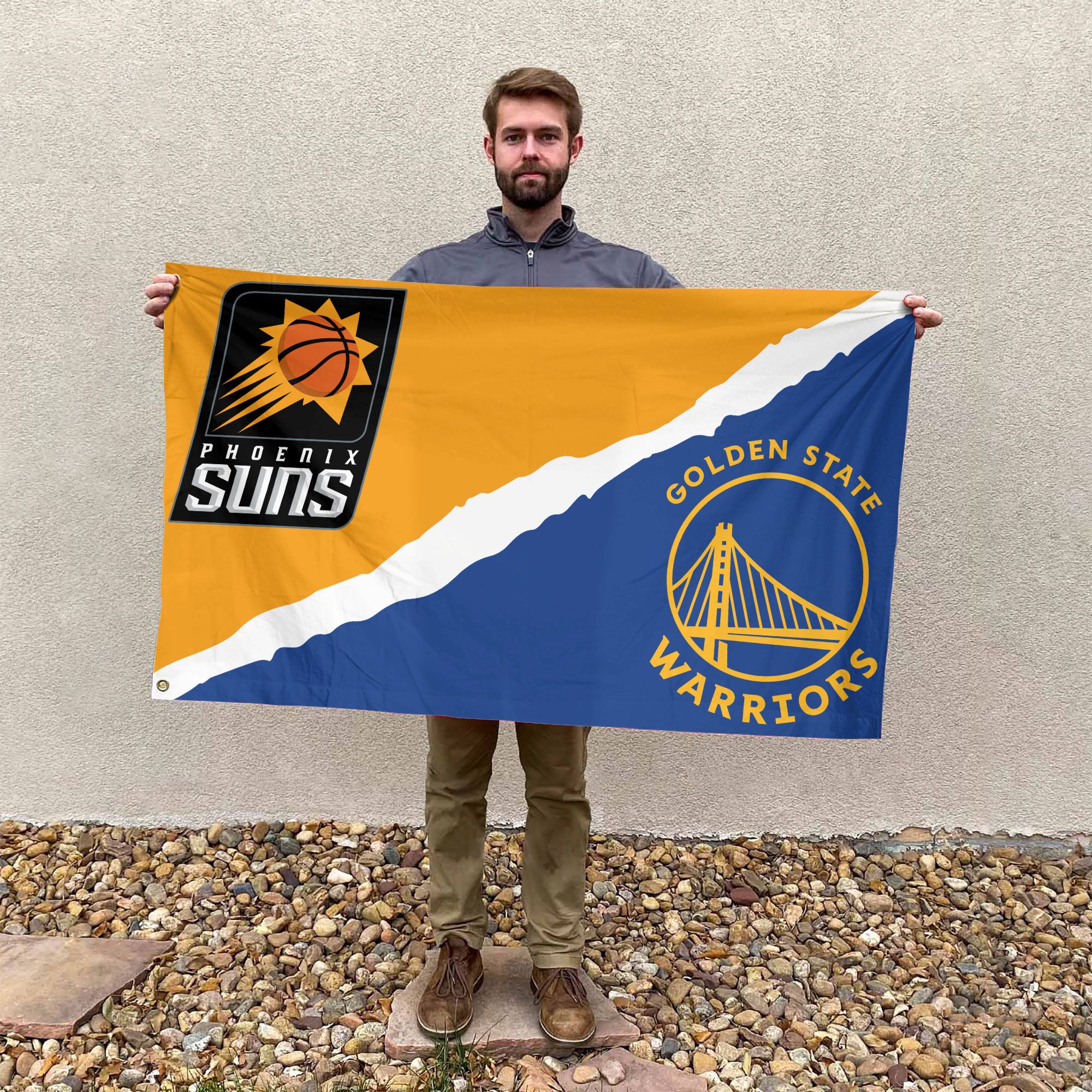 Crafted with premium materials, this vibrant flag displays the iconic logos and colors of both the Phoenix Suns and Golden State Warriors, designed to withstand outdoor conditions while showcasing your team spirit.