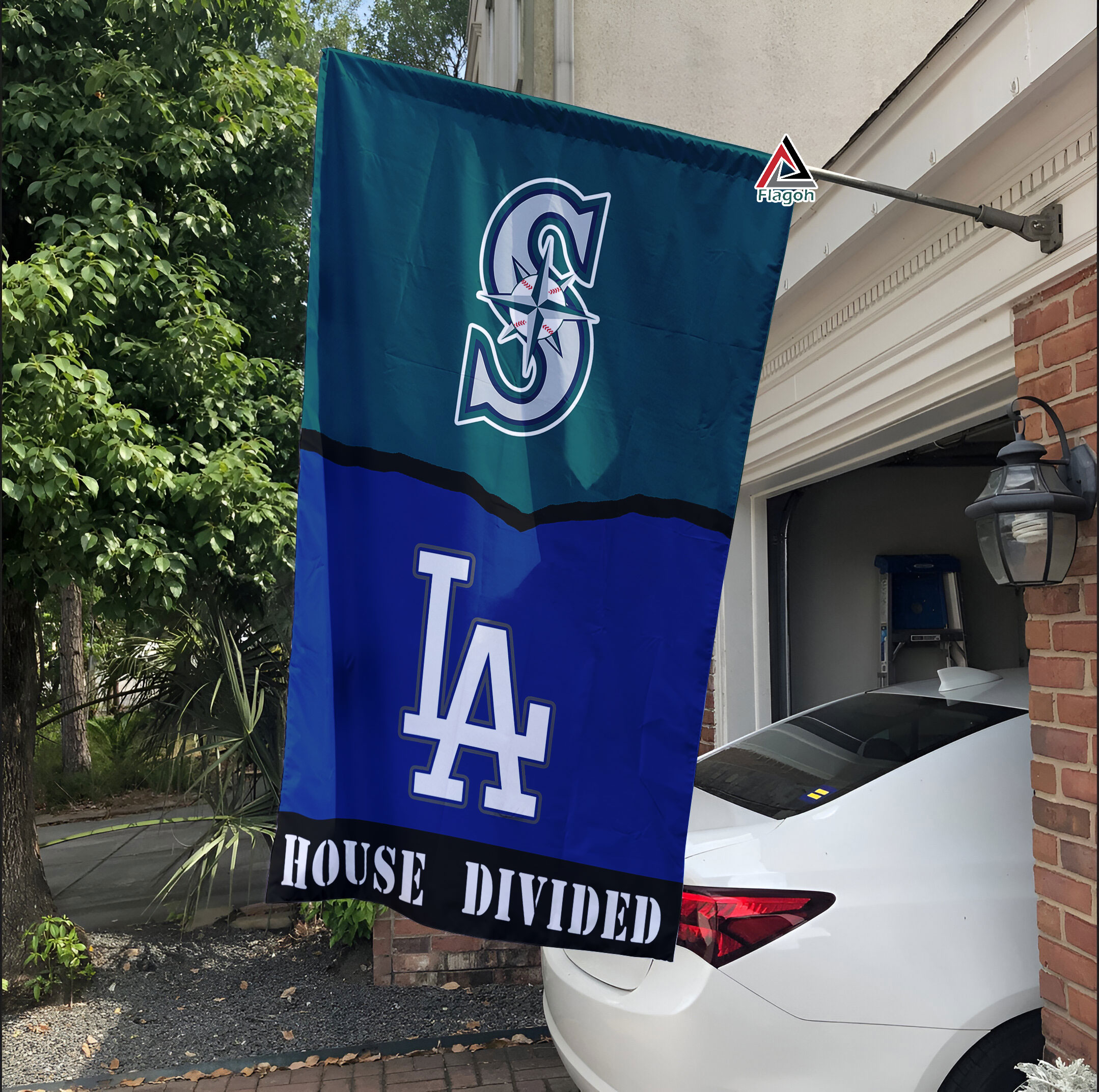 Declare your baseball loyalties, even in a divided household, with a Seattle Mariners vs Los Angeles Dodgers House Divided Flag!