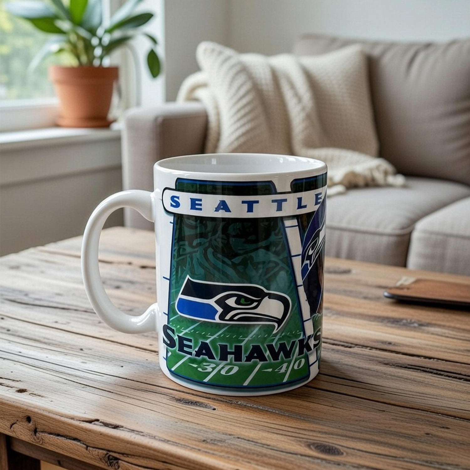 Enjoy your favorite beverage in style with the Seattle Seahawks Coffee Mug Navy Action Green Football Field. Crafted from premium ceramic, this mug offers a durable and long-lasting design that withstands daily use at home or the office. The vibrant print quality captures the dynamic green football field and iconic navy Seahawks logo, ensuring your team spirit shines through every sip. Its comfortable ergonomic handle provides a secure grip, making it easy to enjoy hot coffee, tea, or any beverage throughout the day.