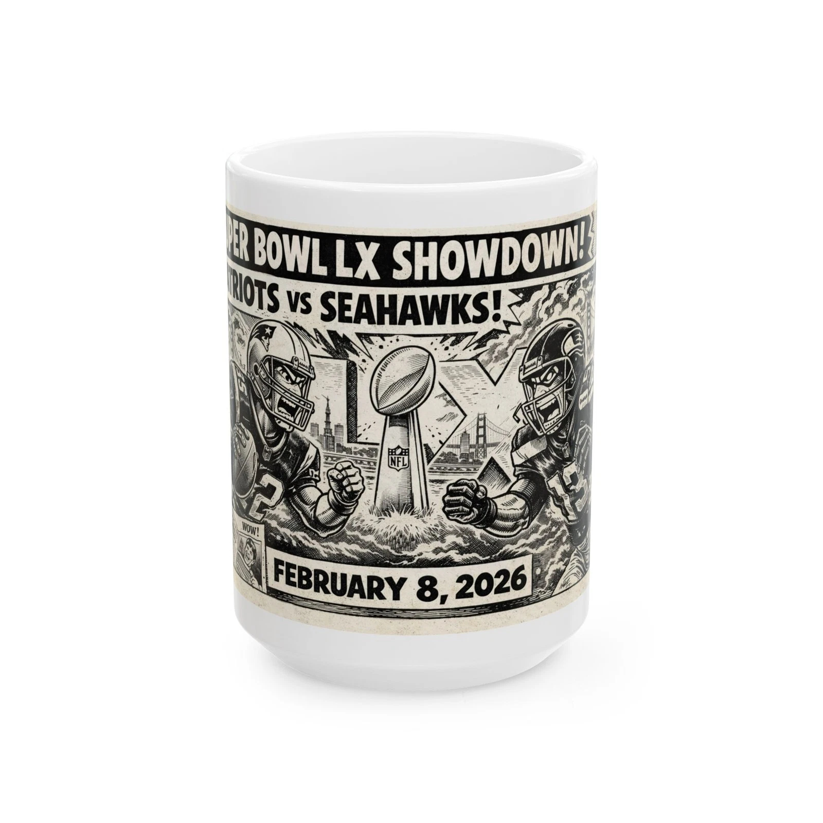 Celebrate the epic showdown between the Seattle Seahawks and Patriots with this stunning Super Bowl LX mug. Crafted from premium ceramic, this 15oz mug offers exceptional durability and a vibrant vintage newspaper comic design that captures the thrilling moments of the game. Its long-lasting print quality ensures the artwork stays vivid wash after wash, making it a must-have for passionate fans and collectors alike. The comfortable ergonomic handle provides a secure grip, perfect for enjoying your favorite hot beverages whether at home or in the office.
