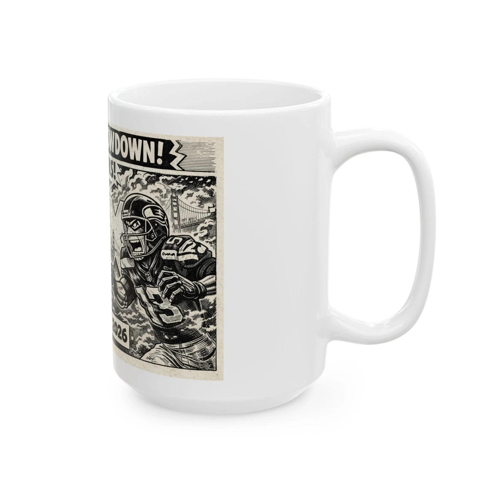 Seattle Seahawks vs Patriots Super Bowl LX Mug 15oz Vintage Newspaper Comic