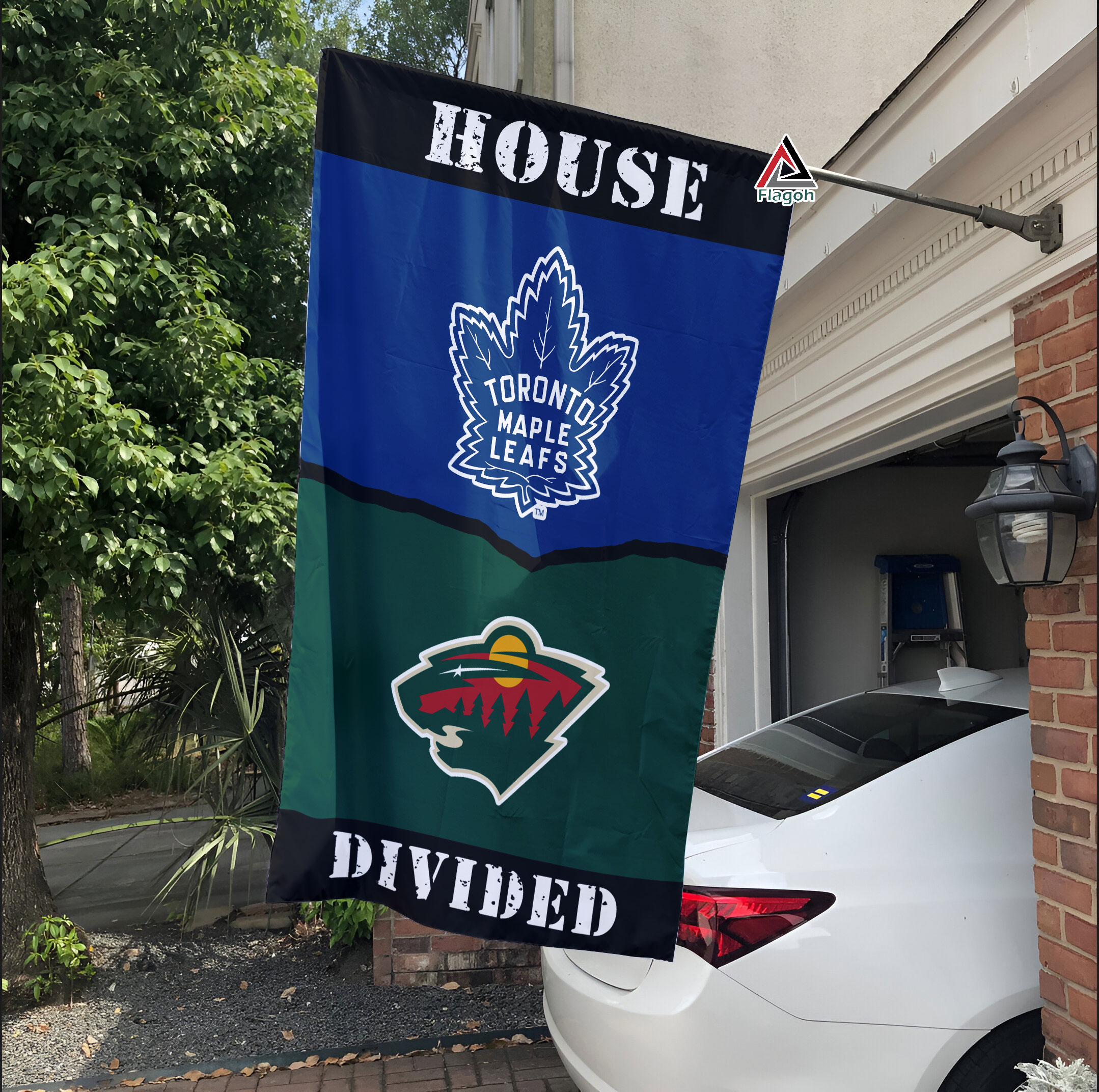 The Maple Leafs vs Wild House Divided Flag represents the ultimate display of team loyalty and rivalry. This flag features the logos of two fierce NHL teams, the Toronto Maple Leafs and the Minnesota Wild, divided down the middle. It is a symbol of the intense competition and passion that exists between these two teams and their fans.
