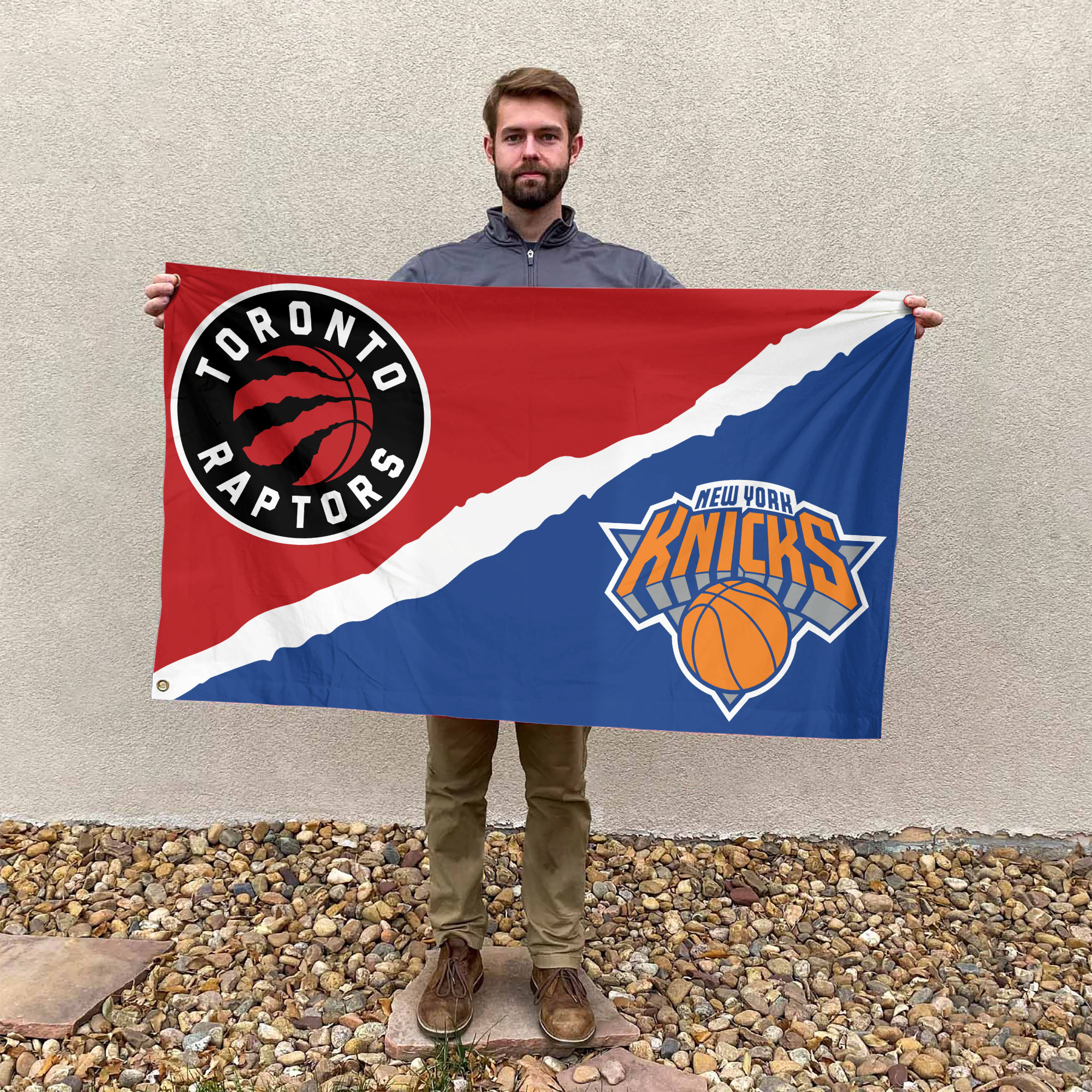 - Distinctive dual-team design perfectly splits the flag to represent both Toronto and New York basketball fans.